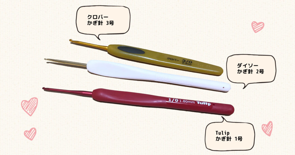 百均では1号のかぎ針は売っておらず、ダイソーの2号が一番近そうです。